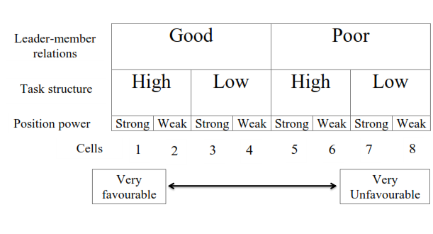 A very favourable situation is one (cell1) where leader-member relations are good, task is highly structured, and leader has enormous position power to influence his subordinates. At the other extreme, a very unfavourable situation is one (cell 8) where leader-member relations are poor, task is highly unstructured, and leader’s position power is weak. Between these two extremes, the degree of favourableness/unfavourableness varies.