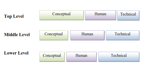 Although they are interrelated and there is no strict demarcation between them but the proportion or relative significance of there skills vary with the level of management which can be understood from the following figure.